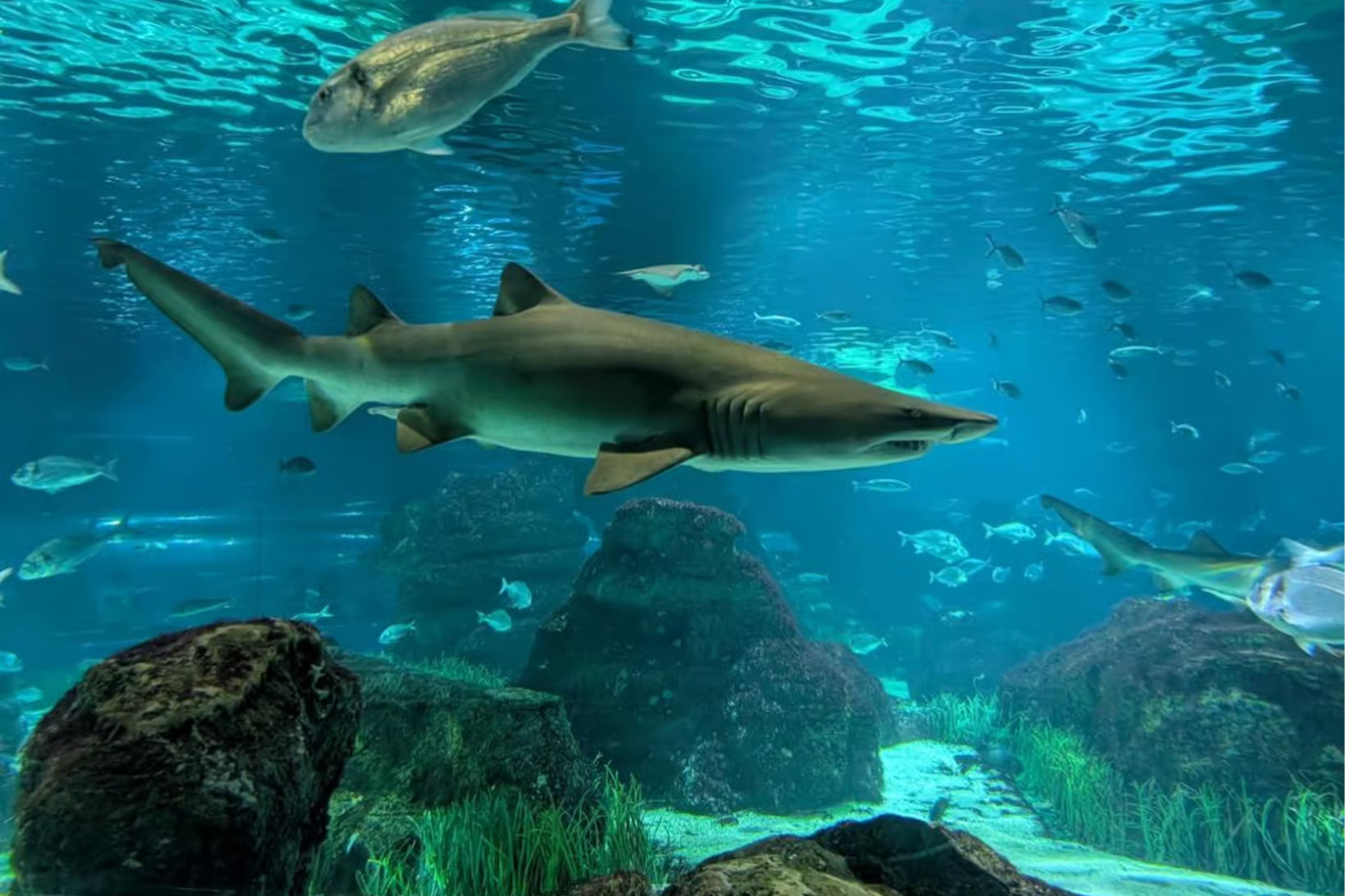Højdepunktet er den ikoniske 80 meter lange glastunnel, hvor du bogstaveligt talt går midt gennem hajernes territorium. Rundt omkring dig svømmer majestætiske gråhajer, elegante rokker, snogende muræner og farverige fisk i en næsten drømmelignende stilhed. Her får du mulighed for at se disse fantastiske væsener helt tæt på, uden glasrude mellem øjne og oplevelse – fordi du selv er midt i det hele.